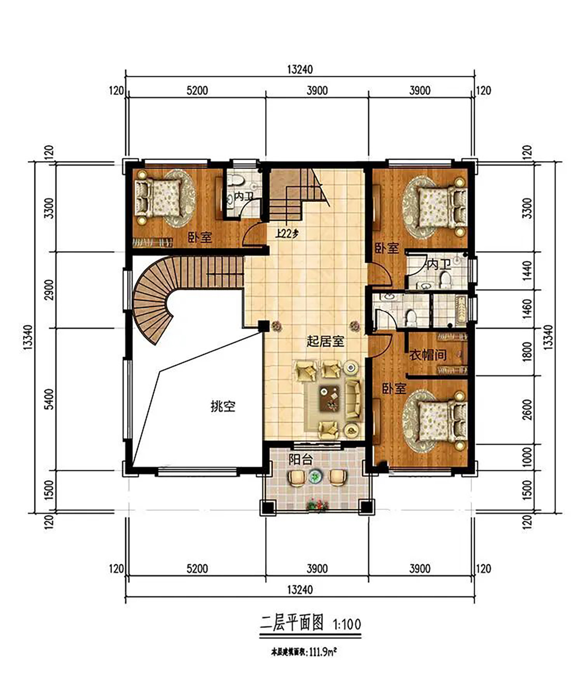 别墅开间为16.7米,进深为13.1米,房屋占地面积158平方米。如果不要柴火灶便可以省去一些面积,那么120平-130平都能建。房屋结构类型为砖混结构,主体造价40-60万之间。室内总共六室三厅,特点是一二层为复式结构,且每层都有一间主卧室。